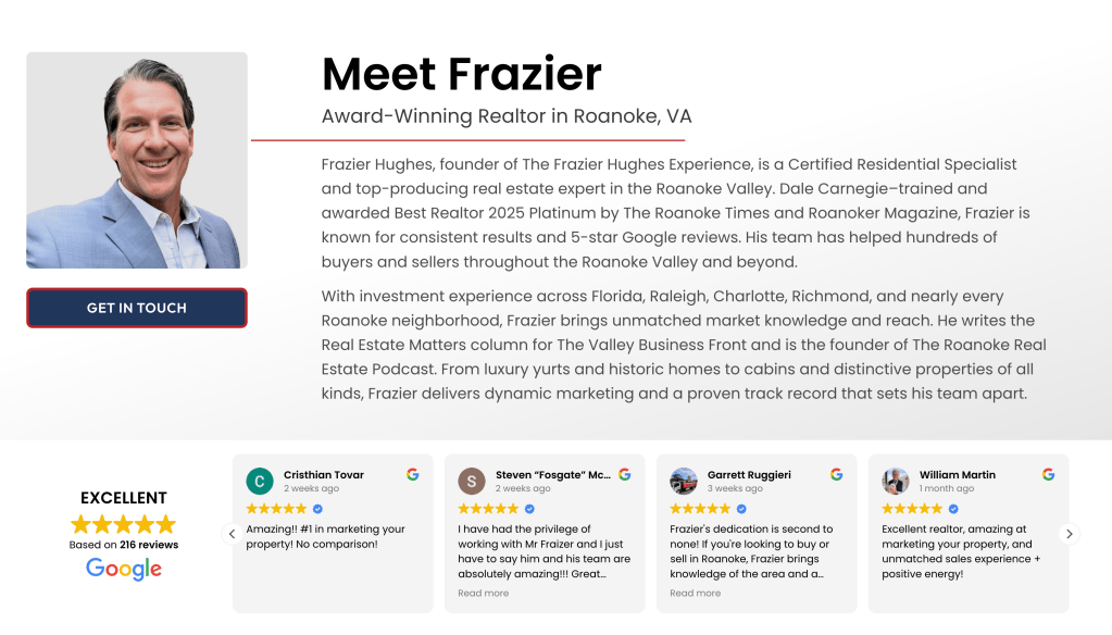 Frazier Hughes is a Certified Residential Specialist Frazier Hughes ‘The Frazier Hughes Experience’ is a top producer in The Valley, Dale Carnegie Trained, and Expert in the field of real estate. He was voted Best Realtor in 2025 Platinum by The Roanoke Times and Roanoker Magazine. His properties sell. 5-Star Google Reviews (google Frazier Hughes) His team has helped hundreds of sellers and buyers in The Roanoke Valley and beyond. His background also includes investment properties spanning Florida, Raleigh, Charlotte, Richmond, and most importantly almost every neighborhood in the Roanoke Valley. He writes a column in the magazine (seen here) The Valley Business Front called ‘Real Estate Matters’ and with a radio background is the founder of The Roanoke Real Estate Podcast. He has a large network locally and nationwide. His outstanding track record and positive mindset prove he and his amazing team are the right choice for all of your real estate needs. His resume is unmatched. Speciality homes like luxury yurts or historical homes, cabins, he sells it all with dynamic marketing like no other.